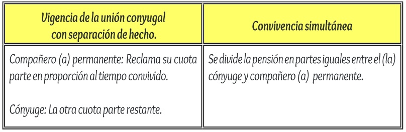 Ahora, y de acuerdo con lo establecido en el artículo 13 de la Ley 797 del 2003, si no existe convivencia simultánea y se mantiene vigente la unión conyugal, pero hay separación de hecho, el compañero(a) permanente podrá reclamar una cuota parte en proporción al tiempo convivido con el causante, siempre que este tiempo haya sido superior a cinco años antes del fallecimiento.