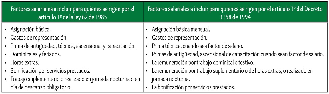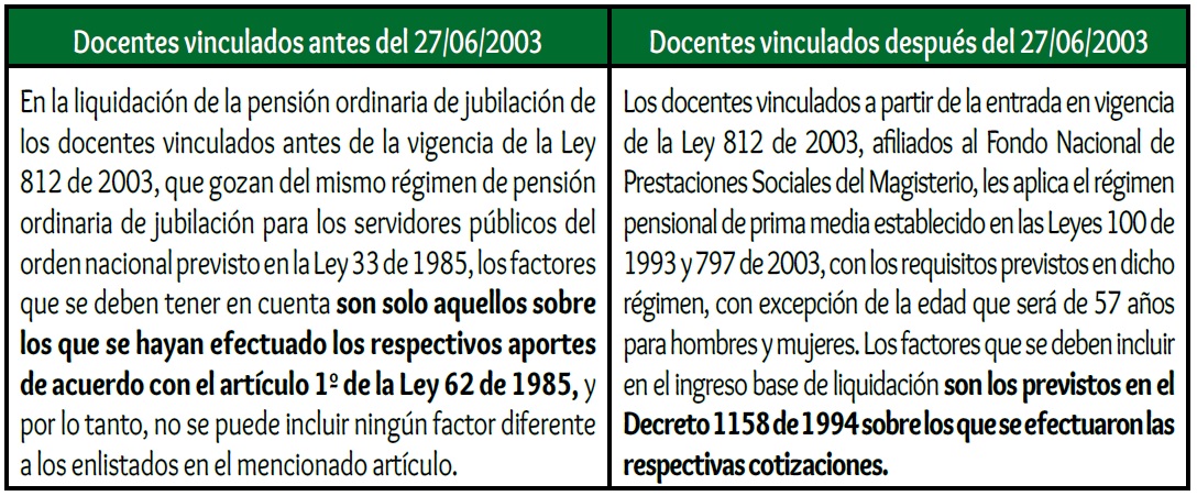 "En consonancia con la normatividad vigente y las directrices jurisprudenciales trazadas en torno a la cuantía de las pensiones de los servidores públicos, es válido tener en cuenta todos los factores que constituyen salario, es decir aquellas sumas que percibe el trabajador de manera habitual y periódica, como contraprestación directa por sus servicios, independientemente de la denominación que se les dé, tales como, asignación básica, gastos de representación, prima técnica, dominicales y festivos, horas extras, auxilios de transporte y alimentación, bonificación por servicios prestados, prima de servicios, incrementos por antigüedad, quinquenios, entre otros, solo para señalar algunos factores de salario, a más de aquellos que reciba el empleado y cuya denominación difiera de los enunciados que solo se señalaron a título ilustrativo, pero que se cancelen de manera habitual como retribución directa del servicio." Fue entonces con base a la tesis anterior, que la mayoría de docentes del país lograron obtener una pensión cuyo monto resultaba ser más cercano al promedio de sus salarios, incluyendo factores cotizados o no.
